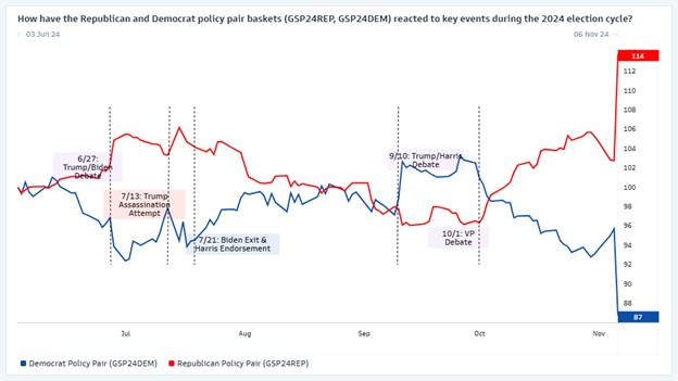 For the last few elections, researchers at Goldman Sachs have identified US equities that could benefit from Republican and Democrat administrations. Researchers then grouped these companies into separate “policy baskets” for each party. As shown in the chart below, shifts in confidence between a Republican versus Democrat victory caused one basket to outperform the other at various points in the campaign season.