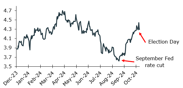 Bond markets also shifted in the run-up to the election as evidenced by the rise in long-term bond yields, which started to rise shortly after the Federal Reserve cut interest rates in September. The 10-year yield has risen 70 basis points since the September cut, likely due to a combination of factors including shifting monetary policy expectations amongst robust economic data. The election-related contribution to the rise is related to the inflationary impact expected from deficit spending, tariffs, and tax cuts. The morning after the election, bonds sold off and the 10-year yield rose by 15 basis points, nearly replicating the bond market’s reaction to the 2016 Trump victory when the 10-year yield rose 20 basis points. By Friday, the 10-year yield returned to its pre-election day level.